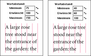 Die Optionen "Minimum", "Erwünscht" und "Maximum" Mit dem Befehl "Schrift"> "Absatz" können Sie Optionen zur Einstellung von "Minimum", "Erwünscht" und "Maximum" für Wort- und Zeichenabstand aufrufen. "Minimum" und "Maximum" sind nur dann von Bedeutung, wenn Blocksatz verwendet wird (Text, der am Rand oder Rahmenversatz rechts- und linksbündig ausgerichtet ist). Mit diesen Optionen können Sie einstellen, wie stark PageMaker beim bündigen Ausrichten einer Zeile von den normalen Werten abweichen darf. Je stärker die Prozentzahlen für "Minimum" und "Maximum" vom Wert "Erwünscht" abweichen, desto stärker werden die Abstände zum Ausrichten der Zeile erweitert oder verringert. ![]() Standardeinstellungen (links) und korrigierte Einstellungen (rechts) Hinweis: Beim Festlegen der Wortabstände muß das "Minimum" kleiner gleich und das "Maximum" größer gleich dem für "Erwünscht" eingestellten prozentualen Wert sein. So stellen Sie Wort- oder Zeichenabstände ein 1 Markieren Sie einen oder mehrere Absätze, oder bearbeiten Sie ein Absatzformat. Wenn Sie ein Absatzformat bearbeiten möchten, wählen Sie "Fenster" > "Formate einblenden", drücken Strg (Windows) oder Befehlstaste (Mac OS) und klicken auf das gewünschte Format. 2 Führen Sie einen der folgenden Schritte aus: 3 Geben Sie im Feld "Wortabstand" oder "Zeichenabstand" wie angegeben neue Werte ein, und klicken Sie auf "OK": Der Wortabstand kann zwischen 0 % und 500 % liegen, der Zeichenabstand zwischen -200 % und 200 %. Gestaltung und Typographie > Einstellen von Wort- und Zeichenabständen > Die Optionen "Minimum", "Erwünscht" und "Maximum" |