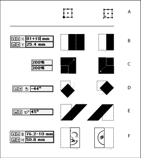 Änderungen an Objekten mit der Kontrollpalette Die Einstellung des Bezugspunktes bestimmt die Art, in der sich die Funktionen der Kontrollpalette auf ein Objekt auswirken. ![]() A. Bezugspunkt B. Verschieben C. Skalieren D. Rotieren E. Neigen F. Beschneiden Grafiken und Textobjekte > Bearbeiten von Objekten mit der Kontrollpalette > Änderungen an Objekten mit der Kontrollpalette |